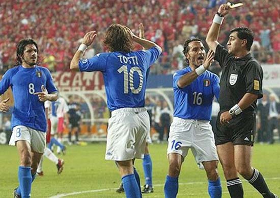 7-2002 Dünya Kupası sekizde bir finalinde İtalya ile Güney Kore arasında oynanan maçta hakem Byron Moreno, İtalya'nın bariz bir golünü geçerli saymadı. Moreno daha sonra da Francesco Totti'ye, hakemi aldatmaya yönelik hareket gerekçesiyle kırmızı kart gösterdi. İtalya kupadan elendi.