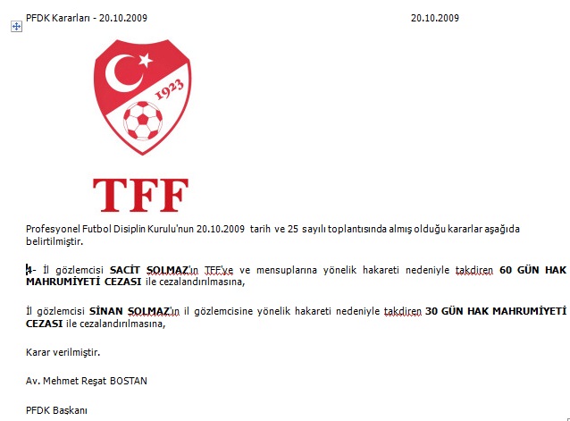 Van İHK başkanı Sacit Solmaz, TFF'ye ve mensuplarına yönelik hakareti nedeniyle takdiren 60 GÜN HAK MAHRUMİYETİ CEZASI ile cezalandırıldı.