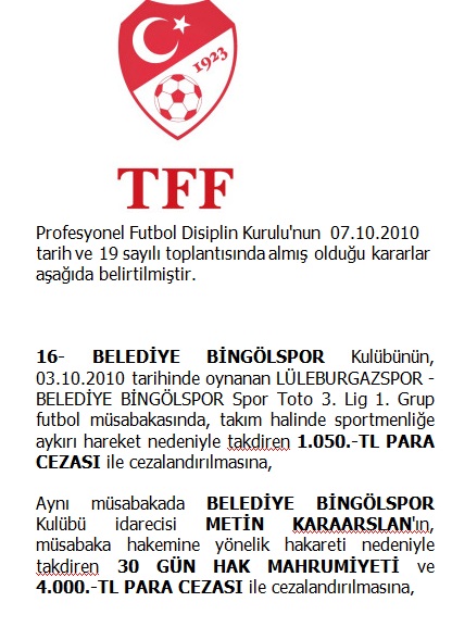 03.10.2010 tarihinde oynanan LÜLEBURGAZSPOR - BELEDİYE BİNGÖLSPOR Spor Toto 3. Lig 1. Grup futbol müsabakasında, BELEDİYE BİNGÖLSPOR Kulübü idarecisi METİN KARAARSLAN'ın, müsabaka hakemine yönelik hakareti nedeniyle takdiren 30 GÜN HAK MAHRUMİYETİ ve 4.000.-TL PARA CEZASI ile cezalandırılıyor.