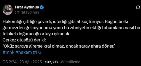Bu paylaşım sonrası TFF, eski hakem Fırat Aydınus’a tam 45 gün boyunca futbol camiasından uzak kalmasını emreden bir ceza kesti.
