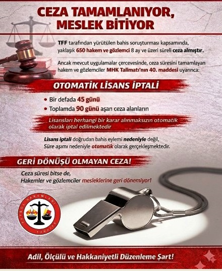 Mevcut şartlarda hakemler ve gözlemciler kendilerine verilen ceza sürelerini tamamladıktan sonra MHK talimatında yer alan otomatik lisans iptali hükmü nedeniyle mesleklerine geri dönemeyecektir.