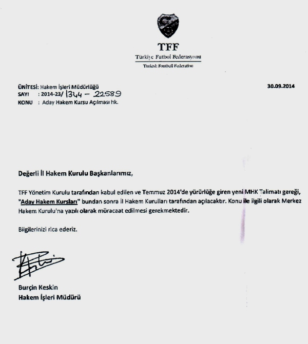 İl hakem kurullarına 30 Eylül 2014 Salı günü Hakem İşleri Müdürü Burçin Keskin imzalı gönderilen yazı ile de bundan böyle “Aday hakemlik kurslarının” il hakem kurulları tarafından açılacağı belirtildi.