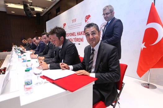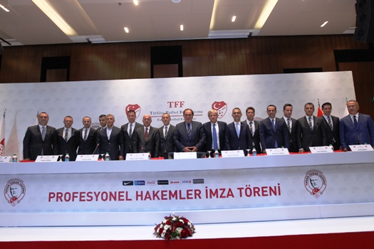 TFF'nin Beykoz-Riva'da yer alan idari merkezindeki Orhan Saka Kongre Salonu'nda gerçekleştirilen imza törenine, TFF Başkanı Yıldırım Demirören, 1. Başkanvekili Servet Yardımcı, Yönetim Kurulu Üyeleri Cengiz Zülfikaroğlu, Ali Düşmez, Yaşar Aşçıoğlu, Merkez Hakem Kurulu Başkanı Kuddusi Müftüoğlu, Başkanvekili Bünyamin Gezer ile TFF Genel Sekreteri Kadir Kardaş katıldı. Konuşmaların ardından hakemlerimiz, profesyonel hakemlik sözleşmesine imza attı.
