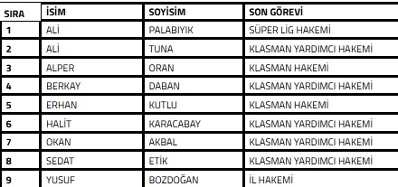 Türkiye Futbol Federasyonu'nca yürütülen bahis soruşturması kapsamında; son 5 yılda TFF bünyesinde hakem olarak görev yapmış ve futbol dalında bahis oynadığı tespit edilen aşağıda isimleri yer alan kişilerin Futbol Disiplin Talimatı'nın 57. maddesi uyarınca 26.12.2025 tarihinden itibaren tedbirli olarak PFDK'ya sevk edilmesine karar verilen isimler şöyle;
