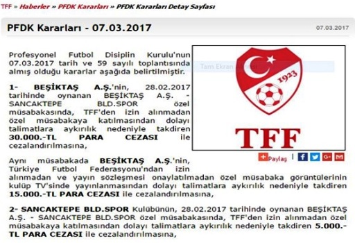 TFF, Beşiktaş – Sancaktepe 28.02.2017 tarihinde Beşiktaş Nevzat Demir tesislerinde bir hazırlık maçı yaptı. Bu maç için TFF’den izin alınmadı. BJK TV’den yayınlandı ayrıca korsan hakemlerle yönetildiği fark edildi. TFF hemen harekete geçti. Maçın 2. Yarısı hemen yayından kesildi. TFF den ceza yağdı.