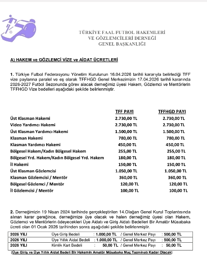 “TFF vize paylarına paralel ve eş olarak TFFHGD vize bedelleri belirlenmiştir”