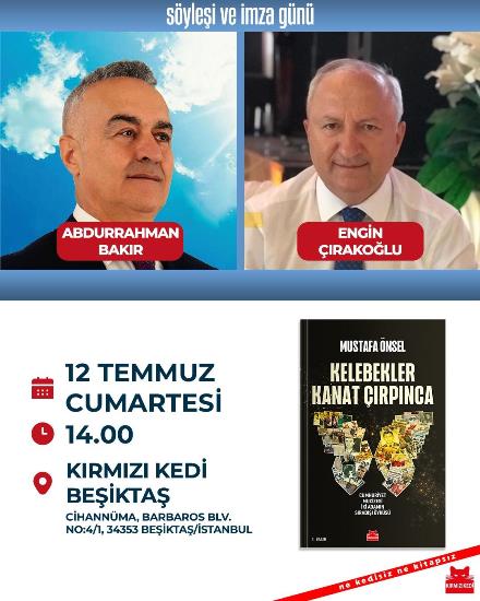 Emekli Kurmay Albay Mustafa Önsel'in, Emekli Tümgeneral Engin Çırakoğlu ve Emekli Albay Prof. Dr. Abdurrahman Bakır ile yaşam öyküsünü konu alan "Kelebekler Kanat Çırpınca" isimli kitabı için İstanbul'da cumartesi ve Pazar günü imza günü ve söyleşi etkinliği düzenlenecek.