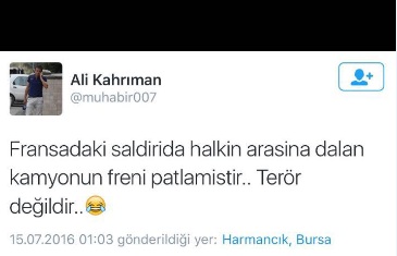 Olay Tweeti atan kişi Bursa bölgesi il hakemi Ali Kahrıman Öğretmen ve AA bir sene muhabirlik yapmış biri. Twette diyor ki; Fransa’da ki halkın arasına dalan kamyonun freni patlamıştır. Terör değildir.. Altında gülücük..